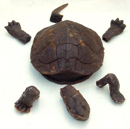 Sometimes an artist prefers to sculpt with a different material than wax, as was done with the turtle. It was originally sculpted out of ceramic clay. The sculpture was then cut up and a plaster molds were made of each of the pieces. (see photo)
