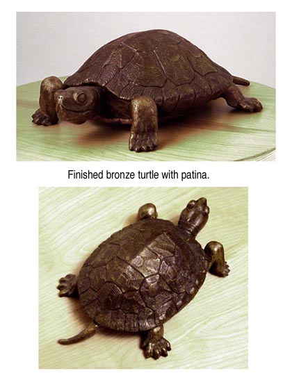A patina is applied to give it the finished desired color, or it may be allowed to patina naturally with age and weathering. A brown and golden patina was applied to the turtle, followed by a light coat of wax to help protect its surface. (see photo)