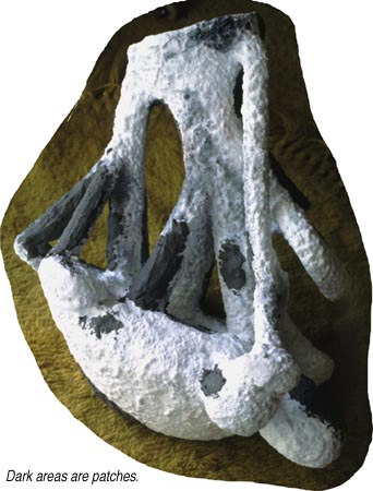 Next the piece is dipped many times in a ceramic material and sand, which must be dried between each applied layer. This process usually takes several days. This produces the ceramic mold. (see photo) The ceramic mold is fired in a kiln to melt out all of the wax (thus the name lost wax). Cuts made to avoid cracking by expansion of the wax, and any cracks that developed in the process are patched and fired with a blow torch. (see photo)