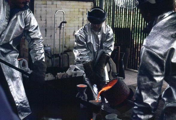 The ceramic mold is then supported in a bed of sand and molten bronze is poured into the mold. (see photo)