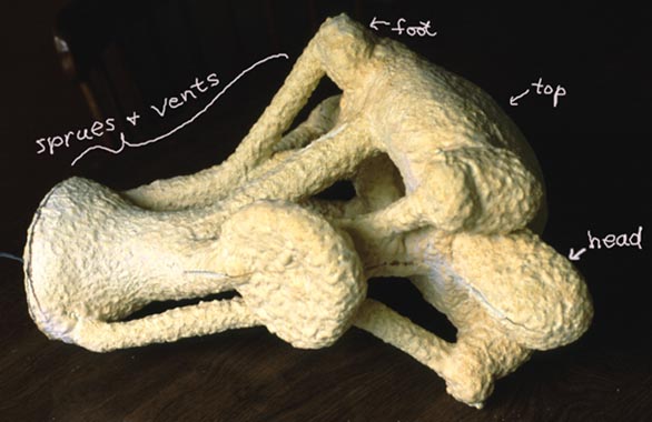 The finished wax figure must next have a wax pouring cup, sprues, and vents attached to allow the bronze to pour in and reach all parts of the sculpture while allowing air to escape and not block the flow of the bronze.