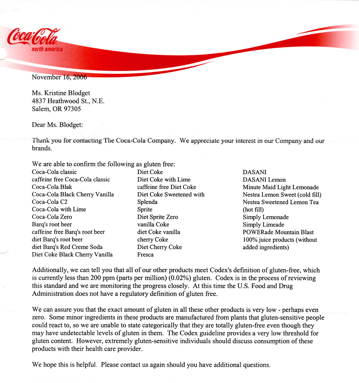 August 2013 the FDA defined the meaning of gluten free labels on foods - see news release: FDA defines GF.pdf