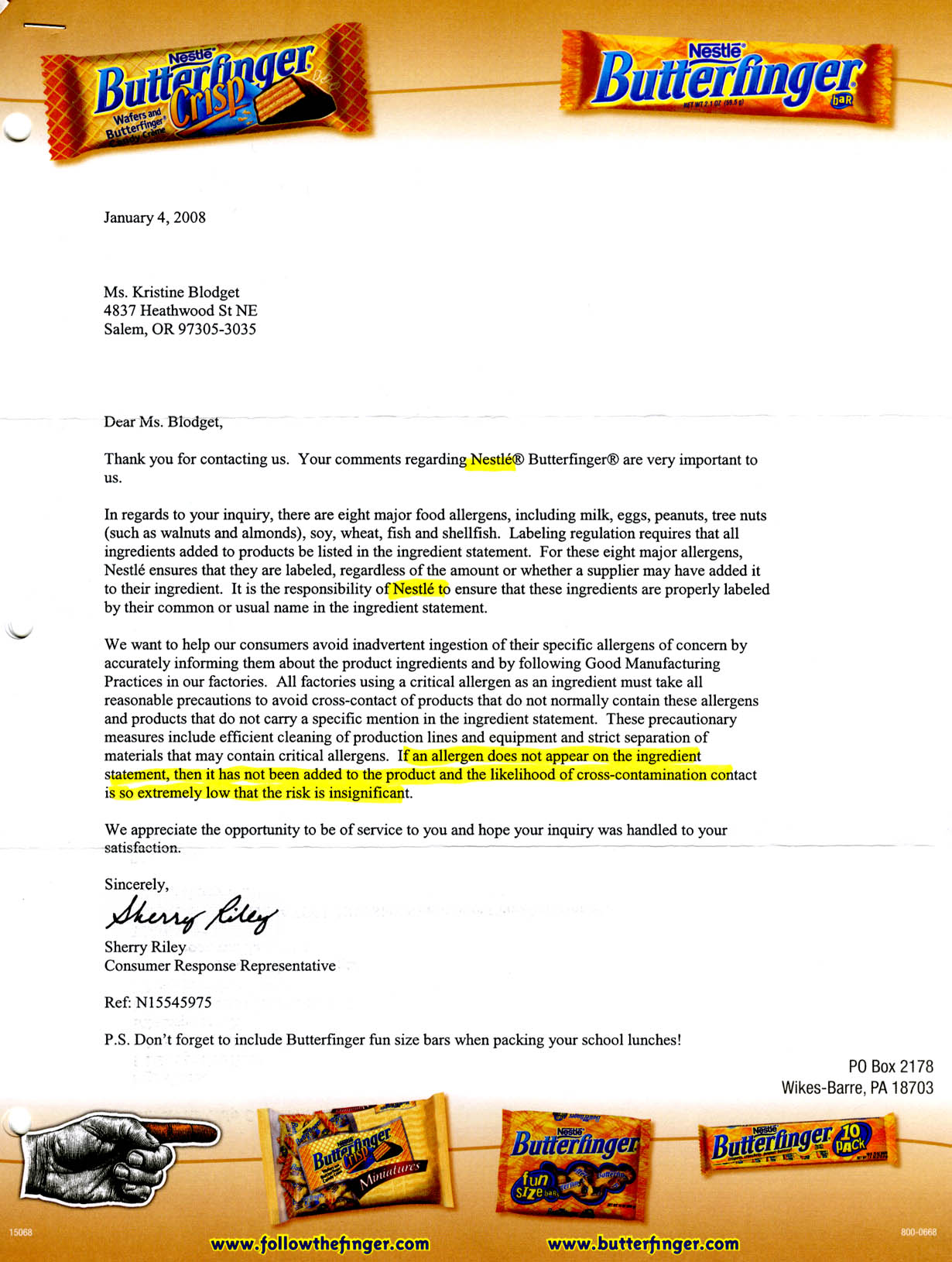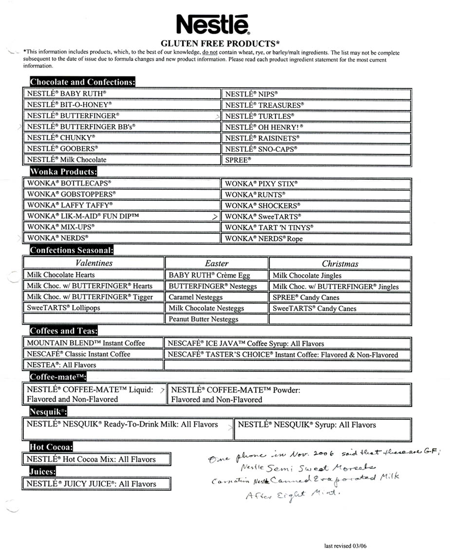 GF include semi-sweet toll house chocolate chips, Butterfinger, After Eight Mints, Wonka, Sweet Tarts, Coffee Mate and more – link to list