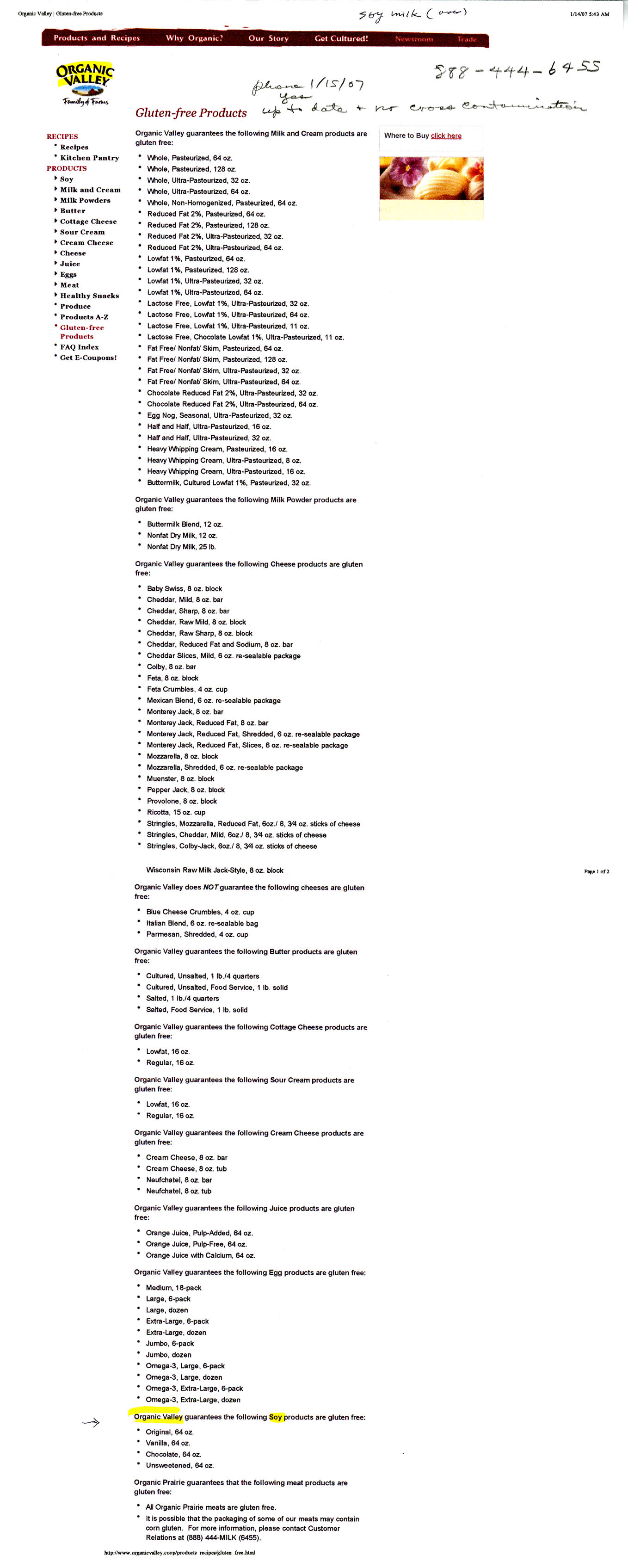 Seeds of Change Dressings – not run on dedicated lines, but cleaned between, so is a small chance of contamination. (phone 2007)